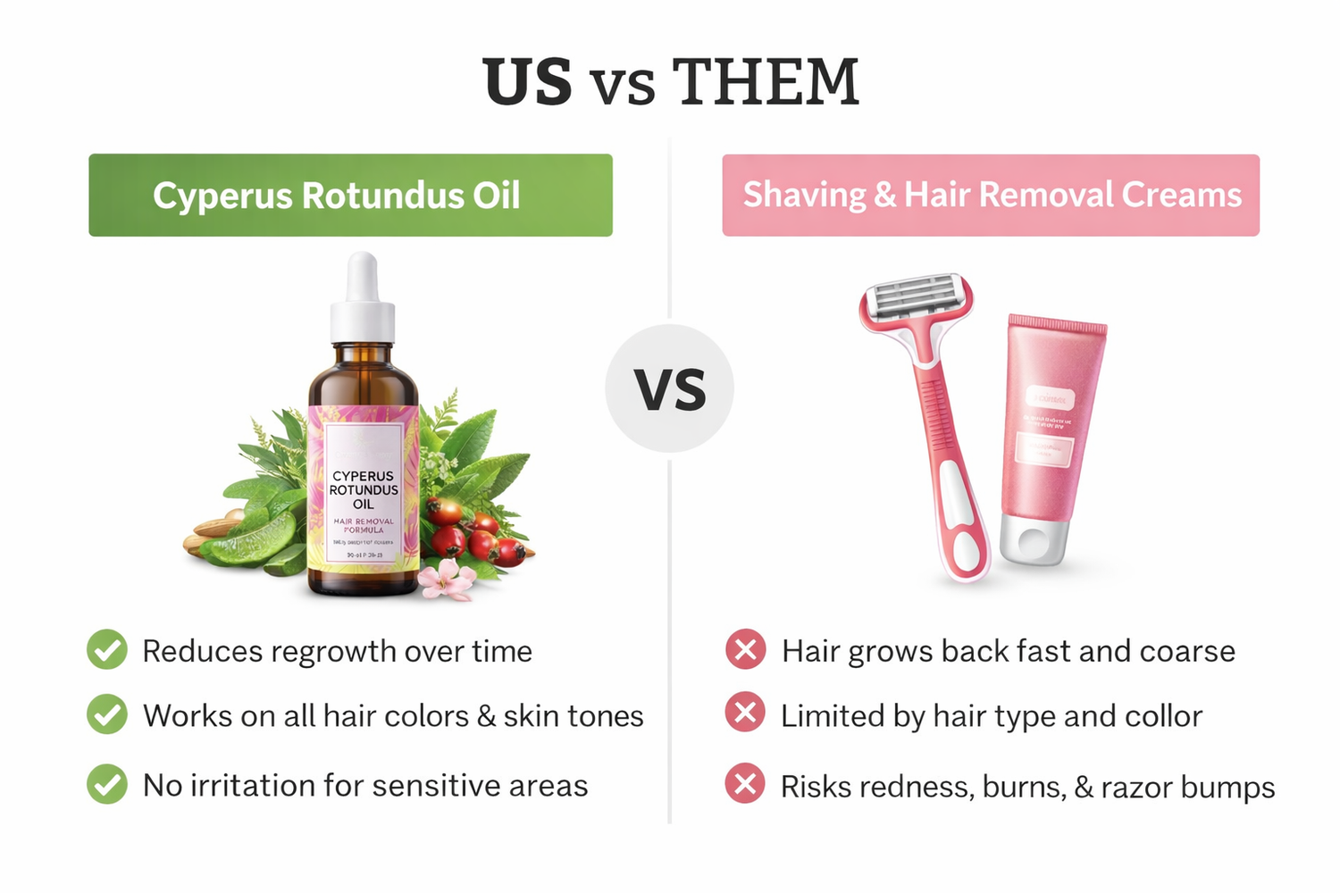 Cyperus Rotundus Oil works differently by helping slow follicle activity, so hair grows back lighter, finer, and slower with continued use.